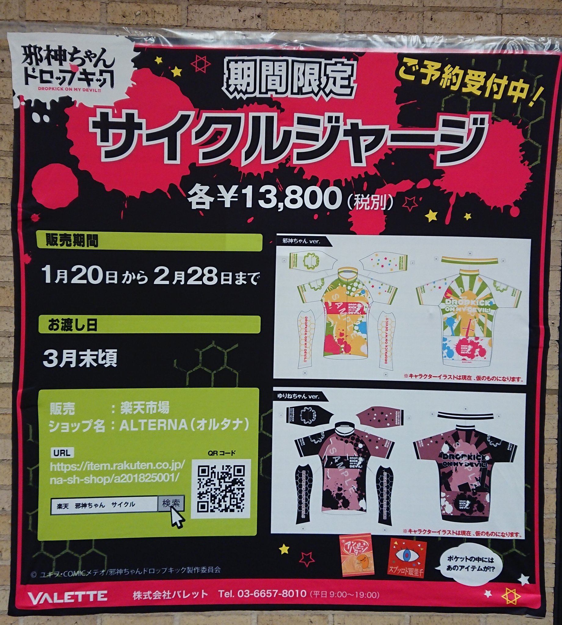 ご確認よろしくお願いいたします! バレット パーティー (@Valette_ltd) on X本日、邪神ちゃんドロップキックのイベント「すごいサバト」にて情報公開となります!邪神ちゃんサイクルジャージとゆりねちゃんサイクルジャージです!デザインはこのままですが後ほど販売ページにてキャラクター部分が差し替わる予定です。ご確認よろしくお...